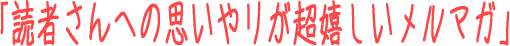 ■ ≫天心竜はなぜ、ここまで読者さんへサービスをする?!(笑)※このページは携帯裏技道(メルマガ)読者さんだけがみることのできる、メルマガ限定特別公開ページです。▼ 先日も、アリスエさんのメルマガで・・・先日、あのアリスエさんが発行されているメルマガで、当メルマガ『携帯裏技道』が紹介されちゃいました! アリスエさん、 ほんとうにありがとうございました!(←私信です) そんないつもやさしいアリスエさんのメルマガで、 当メルマガ『携帯裏技道』はどんな感じで紹介していただいたとおもいますか?? なんと! というお言葉を、アリスエさんからいただいちゃいましたッ!! 「読者さんへの思いやりが超嬉しいメルマガ」 アッハッハ! アリスエさん、わたしもカナリ、嬉しいです(笑) 「あのアリスエさんのメルマガで、うちのメルマガ紹介されちゃった!」 と、メルマガ発行者友だちに自慢もしちゃいました(笑) ▼ メルマガ発行者友だちにも、聞かれたことがあるんです。じつは、メルマガ発行者友だちにも、いぜん、きかれたことがあるんです。 「なぜ、ここまでメルマガ読者さんへサービスをしているの?」 その答えはズバリ! ![]() すべてはこの一言につきます(笑) わたしがなぜ、読者さんからいただくメールにすべてお返事をかいているか。 わたしがまだ、メルマガを発行する立場じゃなかったころ、 メルマガ上で堂々と「お返事はお書きします!」とかいているメルマガ発行者さんに、 メールをお送りしたんです。 しかし、いくらまっても返信が、こない(笑) いま当時お送りしたメールを読み返しても、 決して失礼なメールじゃないんですが、やっぱり返信が届かないんです(笑) それからちょこっとして、 わたしはメルマガを発行する立場になりました(^_^) わたしのメルマガの基本ベースは、 「もじ、じぶんが読者さんだったら、うれしいかどうか」 ここなんですよね。 だから、メールのお返事は99%書いていますし、 こうやって、メルマガ読者限定特典などもつくっているんです(^^)v ![]() これが、すべてのベースです(^_^) 読者さんへメールを99%おかえししているのも、 読者さんへ限定プレゼント企画をしているのも、 読者さんへ限定公開ページをつくっているのも。 すべてはこのベースから(^_^) ちなみに、 わたしのお友だちのヒコさんやアリスエさんも、 この意識をベースにして、メルマガを発行されているんです(^_^) あ、もちろんお二人以外の天心竜の熱き仲間達も、 みなさんこのキモチをベースでメルマガを発行されてますッ! 今日は、そんな読者さんを大切にしてくれている、 ヒコさんのメルマガとアリスエさんのメルマガをご紹介しますね。 【 戻る 】 |